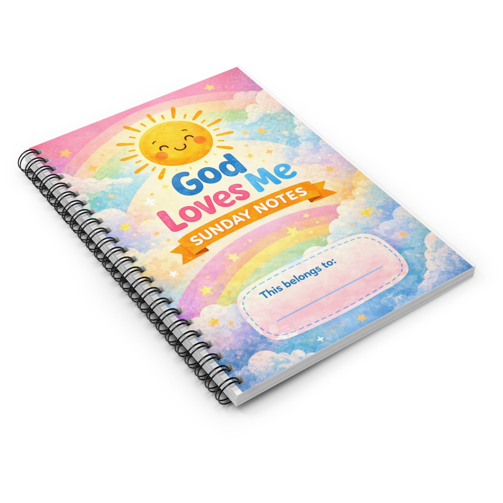 A cheerful, spiral-bound notebook made for little hearts learning about faith and joy. The front cover shows a smiling sun, pastel rainbows, and soft clouds with the words “God Loves Me — Sunday Notes,” inviting kids to capture thoughts, prayers, and reminders from church. Compact and light, it slips into backpacks or pew pockets so children can write, draw, and personalize their spiritual journey. The ruled pages keep handwriting neat, while the inside pocket holds artwork, memory verses, or bulletin clippings. Durable covers and a metal spiral make it easy for small hands to flip pages and remove sheets when they want to share a drawing with family or hang a page on the fridge.