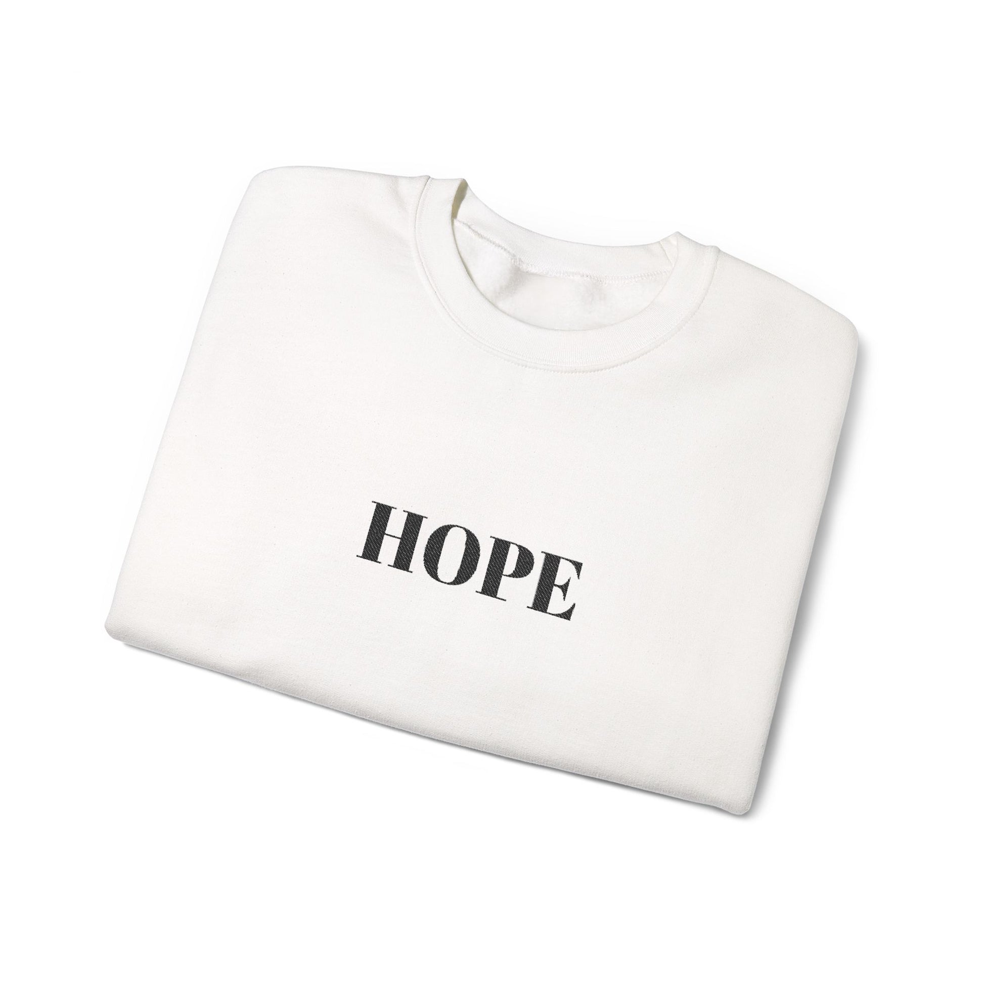 A soft, roomy sweatshirt embroidered with the single word HOPE in a worn, typewriter-like stitch. It feels quiet and steady — the kind of piece you reach for on slow mornings, after long days, or when you want to carry a small, visible reminder with you. The midweight cotton-poly blend holds warmth without weight, the ribbed collar and cuffs keep their shape, and the tear-away neck label keeps the back of your neck comfortable. The subtle, centered embroidery reads like a personal talisman, easy to layer under a coat or over a tee. Wear it to settle in with friends, to travel between appointments, or to show gentle solidarity at a community gathering.